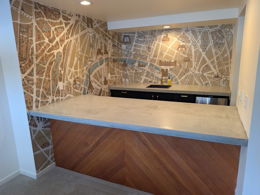 The mural on the back and side wall is a map of Paris – we loved the colors, and it’s cool seeing the design of such a cool city on the walls. It also warms up the room as the black cabinets, bronze hardware, and concrete countertop provide a rather cool appearance.
